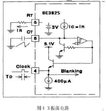振蕩電路如圖4-3所示。UC3823A、B和UC3825A、B內部都有一個鋸齒波振蕩器。鋸齒波上升沿的斜率由RT 、Cr決定,確定RT、CT的方法是:首先根據要求的最大占空比Dmax、選擇RT,再根據要求的頻率以及RT和 Dmax選擇CT 計算公式為: