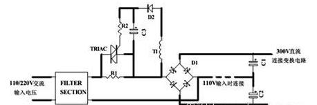對于大功率AC-DC電源,沖擊電流限制器件在正常工作時應該短路,這樣可以減小沖擊電流限制器件的功耗。如下圖所示:選擇R1作為啟動電阻,在啟動后用可控硅將R1旁路,因在這種沖擊電流防止電路中的電阻R1可以選得很大,通常不需要改變110V輸入倍壓和220V輸入時的電阻值。圖中所畫為雙向可控硅,也可以用晶閘管或繼電器將其替代。