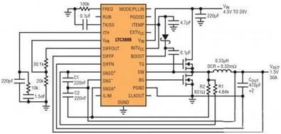 圖 2 顯示了一款以非常低的 DCR 完成采樣的高效率、1.5V/30A 降壓型轉換器。在這個設計中采用了一個 DCR = 0.32m? 的電感器,以最大限度地提高效率。