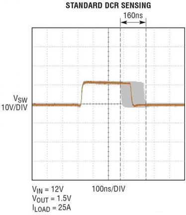 獨特的設計提高了效率以及噪聲靈敏度。在采用非常低的 0.32m? 電感器 DCR 時,最差情況的開關節點抖動減輕了 60%,如圖 5 所示。