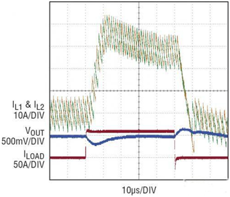 LTC3866 可以與一個電源構件一起使用,以實現更緊湊的設計和非常大的電流。圖 7 顯示了一款由兩個并聯的 LTC3866 + 電源構件電路組成的兩相、高效率、1.5V/80A 電源。盡管該電源構件中電感器的 DCR 僅為 0.53m?,但是在 DC 和瞬態情況下的均流性能是十分出色的 (如圖 8 所示)。