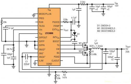 LTC3866 就解決了這個問題,使用該器件可以建立可靠和電流采樣電阻 <0.5m? 的電流模式開關電源。這款單相同步降壓型控制器用內置柵極驅動器驅動所有 N 溝道電源 MOSFET 開關。該器件采用一種獨特的架構,可提高電流采樣信號的信噪比,從而允許使用 DC 電阻 (DCR) 非常低的功率電感器或電阻值非常低的電流采樣電阻器,以最大限度地提高大電流應用的效率。這種特性可降低在 DCR 很低的應用中常見的開關抖動。