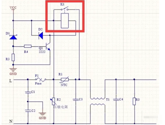 開關(guān)電源中初期階段繼電器是斷開的。當(dāng)VCC逐漸達(dá)到自身電壓的時候,穩(wěn)壓二極管D1導(dǎo)通,三極管Q1打開,繼電器K1閉合,相當(dāng)于把限流NTC熱敏電阻R1短路。