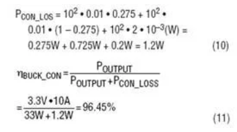 例如,12V輸入、3.3V/10AMAX輸出降壓電源可使用以下元件:MOSFETRDS(ON)=10mΩ,電感RDCR=2mΩ,二極管正向電壓VD=0.5V。因此,滿負載下的傳導損耗為: