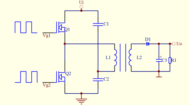 推挽式電路:每個開關管只作業半個周期,管子替換作業,所以輸出功率較大,一起Q1和 Q2是共地的,驅動控制電路也很簡單,能夠選用經典的SG3525驅動。值得注意的是Q1和Q2一起導通時,也就意味著Ll和L3短路。實際中一般設置死區以避免兩個管子一起導通。