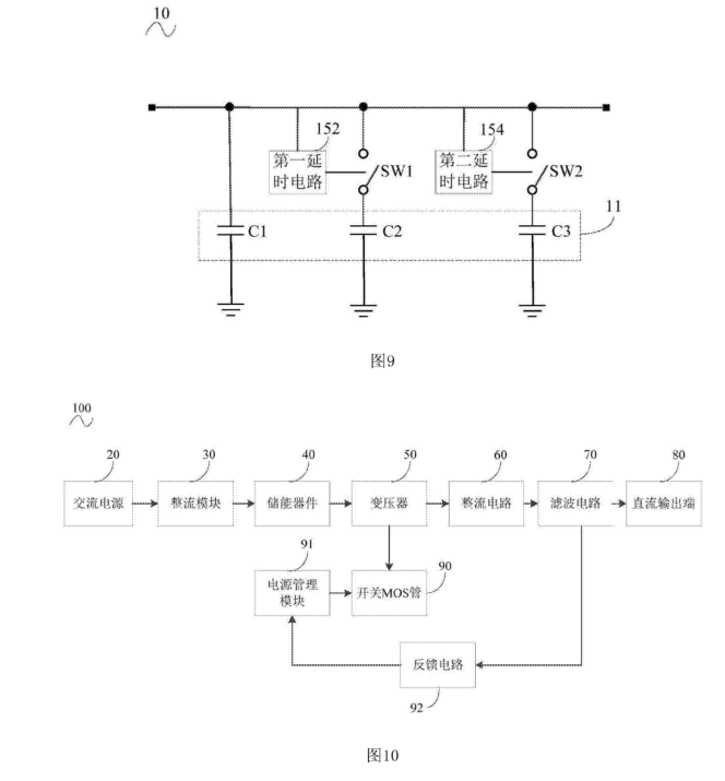 1.開關電源的起動電路包含:電容電路,電容電路的電容值可調;和與電容電路銜接的調節器材,調節器材用于在開關電源上電過程中依照設定時序調整電容電路的電容值以改動起動電路的電容值。電容電路包含多個電容,多個電容并聯,調節器材包含開關器材,開關器材包含與多個電容銜接的至少一個開關件,每個開關件與至少一個與電容串聯。調節器材用于調整可調電容的電容值。