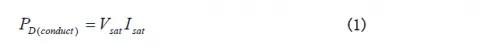 導(dǎo)通損耗可由開關(guān)兩頭電壓和電流波形乘積測得。這些波形都近似線性,導(dǎo)通期間的功率損耗由式(1)給出。