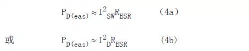 輸入輸出電容是功率開關(guān)或輸出整流器產(chǎn)生的高頻電流的唯一來源(或儲存處),所以通過觀察這些電流波形可以合理地確定流過這些電容ESR的電流。這個電流不可避免地在電容內(nèi)產(chǎn)生熱量。設(shè)計濾波電容的主要任務(wù)就是確保電容內(nèi)部發(fā)熱足夠低,以保證產(chǎn)品的壽命。式(4)給出了電容的ESR所產(chǎn)生的功率損耗的計算式。
