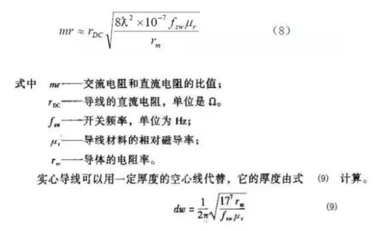電阻損耗是變壓器或電感內(nèi)部繞組的電阻產(chǎn)生的損耗。有兩種方法的電阻損耗:直流電阻損耗和集膚效應(yīng)電阻損耗。直流電阻損耗由繞組導(dǎo)線的電阻與流過的電流有效值二次方的乘積所選擇。集膚效應(yīng)是因?yàn)樵趯?dǎo)線內(nèi)強(qiáng)交流電磁場效果下,導(dǎo)線中心的電流被“面向”導(dǎo)線外表而使導(dǎo)線的電阻實(shí)踐添加所致,電流在更小的截面中活動使導(dǎo)線的有效直徑顯得小了。式(8)給出了這兩個損耗在一個表達(dá)式中的計算式。