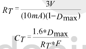 振動電路如圖4-3所示。UC3823A、B和UC3825A、B內部都有一個鋸齒波振動器。鋸齒波上升沿的斜率由RT、Cr決議,確認RT、CT的辦法是:首要依據要求的最大占空比Dmax、挑選RT,再依據要求的頻率以及RT和Dmax挑選CT計算公式為: