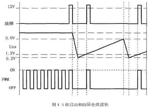 在軟發動期問,假如故障鎖存器置位,輸出會立即間斷??墒擒洶l動腳外接電容在足夠電之前不會放電。這樣,在故障接連呈現的狀況下,輸出就會呈現一個間斷期。
