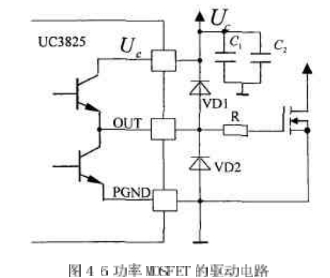 功率MOSFET驅動電路如圖4-6所示。UC3825推拉式輸出電路的每個輸出端都可輸出峰值為2A的電流。該輸出電流在20ns內可使1000pF電容兩端的電壓上升15V。選用獨立的集電極電源Uc和功率地線PGND腳,能夠減小大功率門極驅動噪聲對集成電路內模仿電路的攪擾。每個輸出端(OUT)到Uc和PGND之間,都應參加一只3A的肖特基二極管(IN5120,USID245或相同功用的器材),如圖4-6所示。該二極管可將輸出電壓的幅值鉗位在電源電壓,這對任何電感性和電容性負載都是必要的。