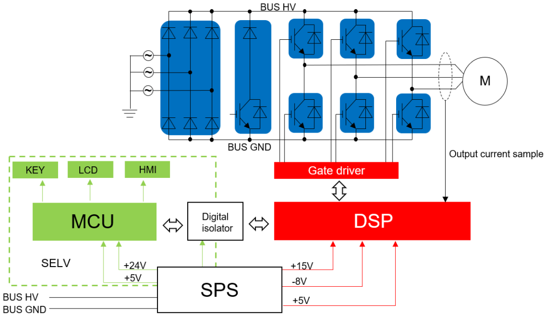 如圖4所示三相變頻器中,左下角綠色虛線圍起來的部分就是SELV電路,輔助開關(guān)電源SPS左側(cè)的供給MCU的+24V,+5V兩路開關(guān)電源與SPS的其余的電壓輸入輸出電氣連接點(diǎn)之間,都必須滿足加強(qiáng)絕緣要求。