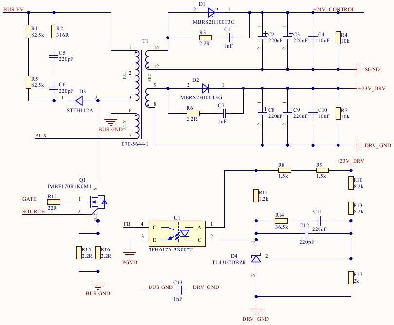 假設(shè)輔助開關(guān)電源SPS采用了經(jīng)典的單管反激變換器,如圖5所示,SPS從變頻器的BUS電容上取電,這里為了簡化電路,變壓器T1的輸出只設(shè)計了兩路輸出電壓,分別給IGBT的驅(qū)動器和MCU側(cè)供電,從前面的定義可以看出,給MCU供電的+24V_CONTROL就是SELV電路,需要與其他電路之間做加強(qiáng)絕緣處理,也就是變壓器T1的pin12-pin14所在的繞組與其余繞組之間必須滿足加強(qiáng)絕緣要求,同時,在PCB板上,+24V_CONTROL所在電路與其他電路之間的爬電距離也必須滿足加強(qiáng)絕緣要求。