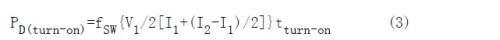 導(dǎo)通損耗可由開關(guān)兩端電壓和電流波形乘積測得。這些波形都近似線性,導(dǎo)通期間的功率損耗由式(1)給出。