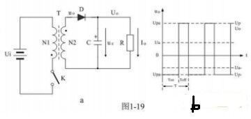 圖1-19-a是反激式變壓器開關電源的簡單工作原理圖,圖1-19-a中,Ui是開關電源的輸入電壓,T是開關變壓器,K是控制開關,C是儲能濾波電容,R是負載電阻。圖1-19-b是反激式變壓器開關電源的電壓輸出波形。
