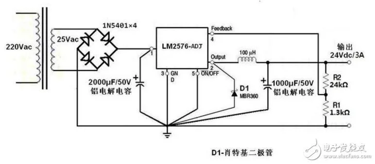 實(shí)用電路如下圖,比例電阻R1和R2的阻值之比設(shè)置為1:18.51,輸出電壓就等于24伏。