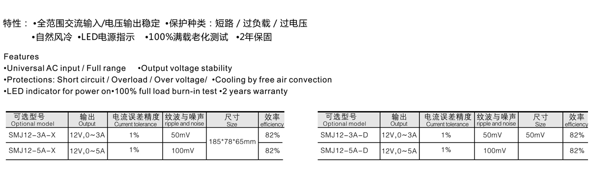 全范圍交流輸入/電壓輸出穩定 有短路、過載、過熱保護 自然風冷散熱 LED電源指示 100%滿負荷燒機測試